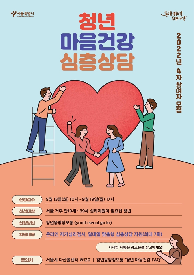 [영등포신문=이천용 기자] 서울시가 오는 19일 오후 5시까지 ‘서울 청년 마음건강 지원사업’ 참여자 2,000명을 추가로 모집해 일대일 심층상담(7회)을 지원한다. 올해 마지막 모집으로, 불안, 우울감, 무기력감을 경험하고 있는 만 19~39세 서울 거주 청년이면 누구나 청년 몽땅 정보통(https://youth.seoul.go.kr)에서 신청할 수 있다.