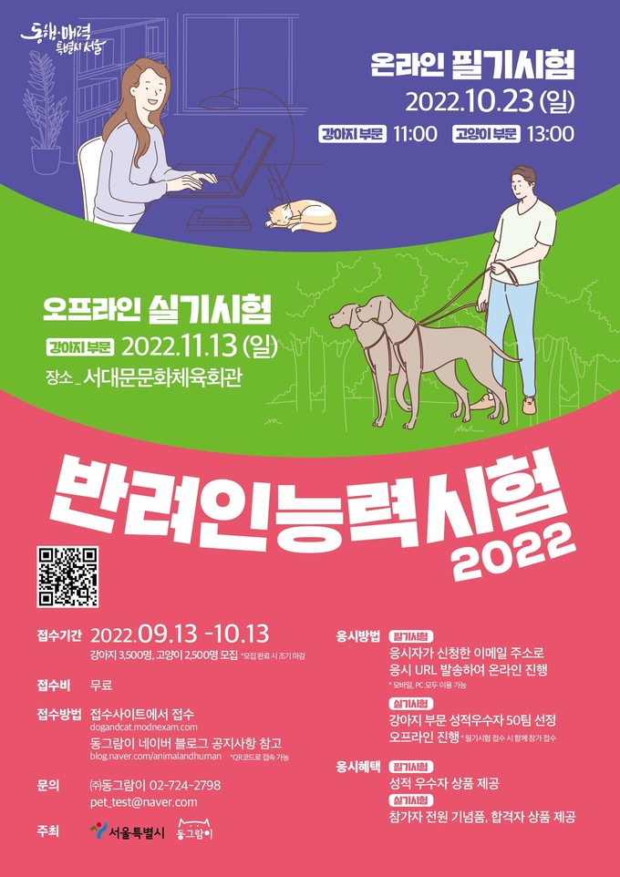 유영봉 서울시 푸른도시여가국장은 “서울시 반려인능력시험을 통해 반려동물에 대한 이해를 넓히고 펫티켓을 배워 사회적 갈등도 예방할 수 있는 뜻깊은 기회가 되길 바란다”며 “서울시는 성숙한 반려동물 문화의 확산을 위해 앞으로도 시민이 동참할 수 있는 다양한 사업을 추진하겠다”고 말했다.