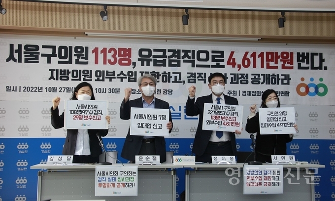 경제정의실천시민연합은 27일 오전 기자회견을 열고 서울시의회 및 25개 구의회 의원 539명의 겸직신고 현황을 조사 분석해 지방의원들이 겸직을 통해 얻는 외부수입과 임대수입이 어느 정도인지, 지방의회 의장이 지방의회의원의 겸직 행위에 대한 심사를 제대로 하고 있는지 등을 파악해 발표했다.