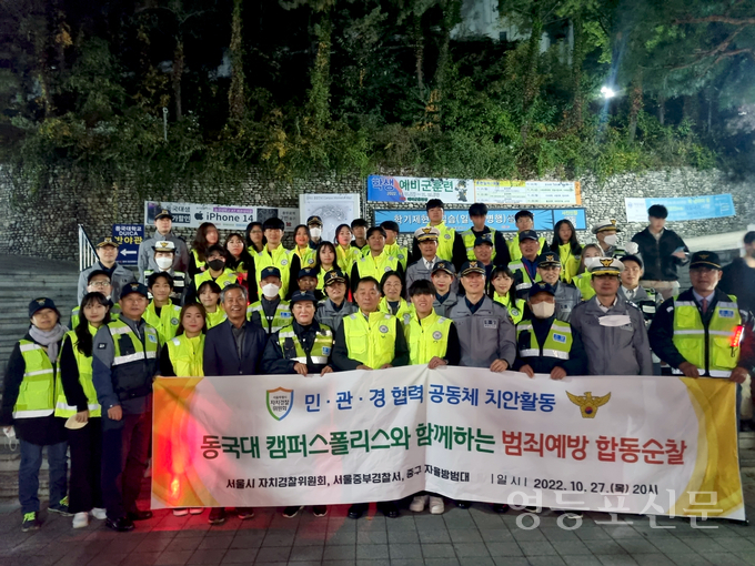 [영등포신문=이천용 기자] 서울시 자치경찰위원회가 지난 27일 오후 8시부터 9시까지 서울중부경찰서, 동국대학교 대학생 순찰대 ‘캠퍼스 폴리스’와 함께 동국대 일대를 중심으로 야간 합동 순찰을 실시했다고 밝혔다.