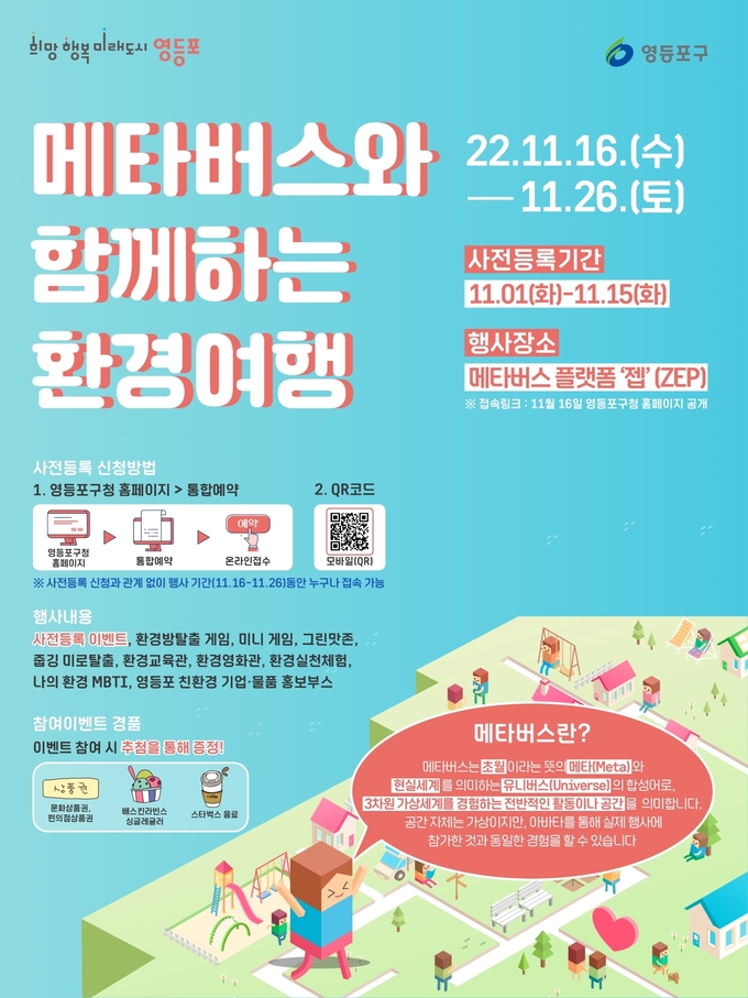 [영등포신문=이천용 기자] 영등포구는 오는 11월 16일부터 26일까지 지역사회의 기후위기 대응력 강화를 위한 ‘메타버스와 함께하는 환경여행’을 운영한다고 밝혔다.