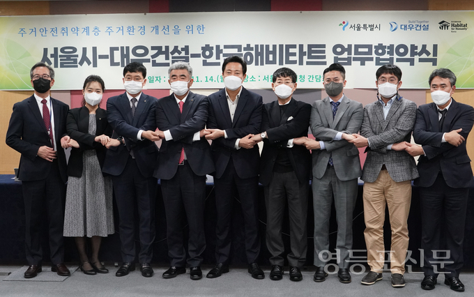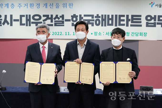 이를 위해 서울시는 14일 오전 서울시청 8층 간담회장에서 한국해비타트, 대우건설과 '주거안전 취약계층 주거환경 개선을 위한 업무협약'을 맺었다. 이날 협약식에는 오세훈 서울시장, 윤형주 한국해비타트 이사장, 정원주 대우건설 부회장이 참석했다.
