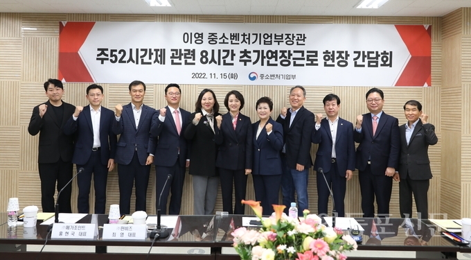 이날 간담회는 30인 미만 사업장에 적용 중인 8시간 추가연장근로제의 활용 상황을 점검하고, 경영상황 악화, 납기 미준수에 따른 거래관계 단절 등 제도 유효기간 종료(2022년 12월 31일)시 겪게 될 각종 애로사항에 대한 현장의 목소리를 듣기 위해 마련됐다.