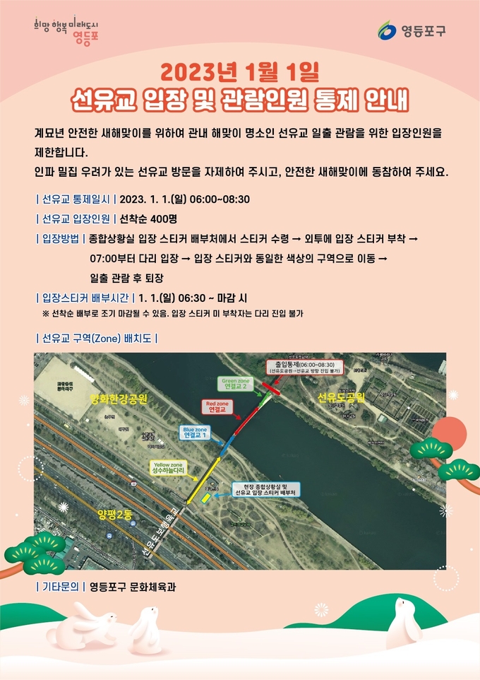 이에, 양화한강공원과 선유도를 잇는 성수하늘다리~선유교 구간은 2023년 1월 1일 오전 6시부터 오전 8시 30분까지 일반인 출입이 전면 통제된다. 오전 7시부터 오전 8시 30분까지는 입장 스티커를 받은 시민에 한해서 선유교 출입이 가능하다. 입장 스티커를 받은 시민은 본인의 스티커 색깔과 똑같은 색의 구역에서 일출을 관람해야 한다.