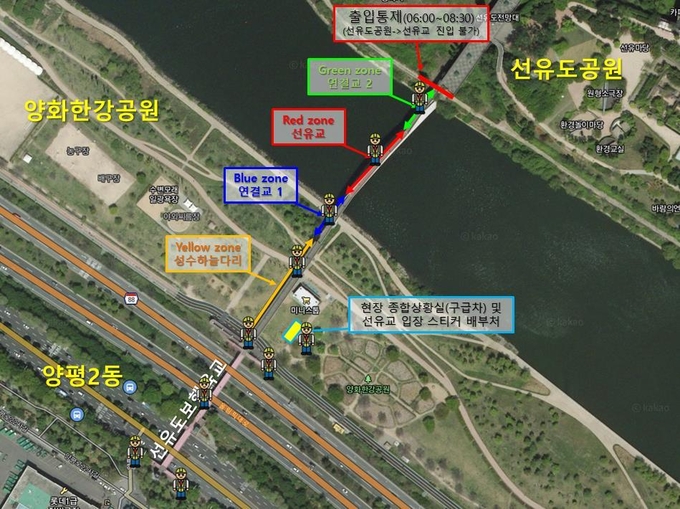 구는 성수하늘다리~선유교 구간에 입장하는 시민들이 특정 구간으로 몰리지 않고 안전하게 관람할 수 있도록 색깔별로 구역을 나눠 관리한다. 안전요원들은 방문객들이 많이 몰릴 것으로 예상되는 구간에 집중적으로 배치돼 선유교 통제에 관한 사항 등을 안내할 계획이다.