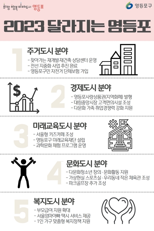‘달라지는 영등포’는 생활에 유용한 정책정보를 알기 쉽게 정리한 안내서로 매년 연말 공개된다. 올해는 △주거도시 16건 △경제도시 7건 △미래교육도시 6건 △문화도시 11건 △복지도시 21건 총 5개 분야 61개 사업을 엄선해 소개한다.