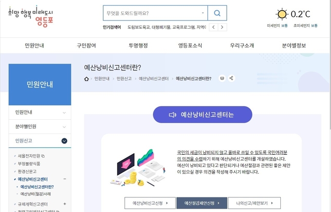 그동안 구민은 영등포구 홈페이를 통해 예산낭비를 신고할 수 있었다. 그러나 온라인 신고뿐만 아니라 주민민센터에 방문하여 신고할 수 있도록 관내 18개 동 주민센터에 예산낭비신고 접수 창구를 마련했다.