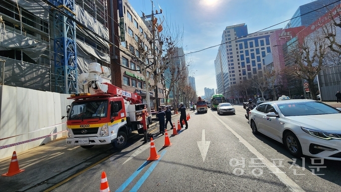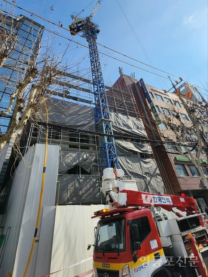 [영등포신문=이천용 기자] 9일 오후 1시 30분 경 영등포구 영등포동8가 신축 오피스텔 공사장에서 크레인 작업 중 고압선 단선으로 주변 일대가 일시 정전되는 사태가 발생했다.