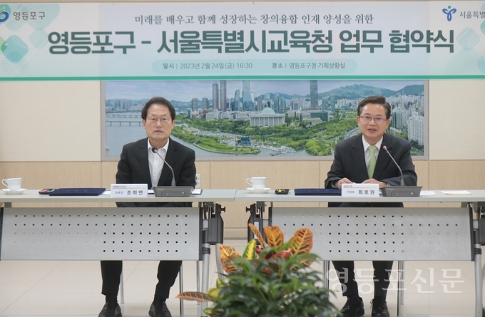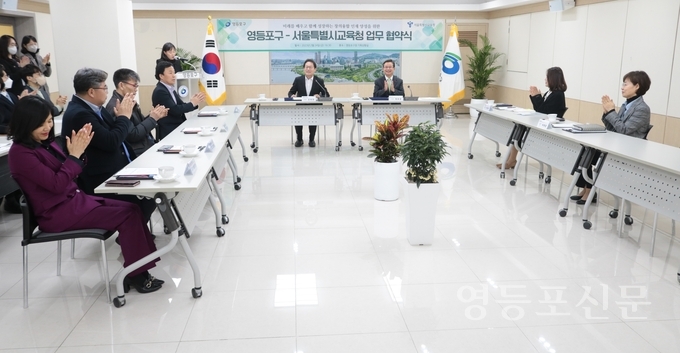 24일 오후 4시 30분 영등포구청 3층 기획상황실에서 열린 ‘미래를 배우고 함께 성장하는 창의융합 인재 양성을 위한 업무 협약식’에는 최호권 구청장, 조희연 서울시교육감, 홍성철 남부교육지원청 교육장, 영등포구 이영은 미래비전추진단장, 차해엽 미래교육과장, 서울시교육청 고승은 지역사회협력담당장학관, 남부교육지원청 윤석만 행정지원국장, 배현정 교육협력복지과장 등이 참석한 가운데 진행됐다.