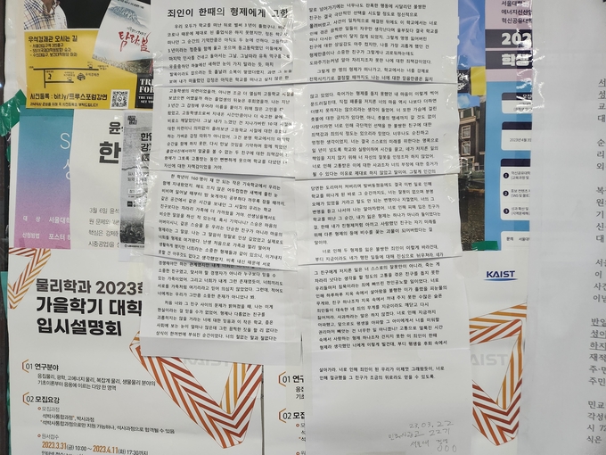 지난 22일 서울대 중앙도서관 게시판에 공개된 대자보는 '죄인이 한때의 형제에게 고함'이라는 제목으로 정 변호사 아들에게 보내는 편지 형식으로 쓰여졌다.