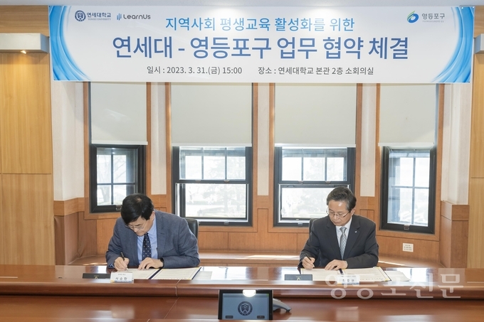 3월 31일 연세대 본관에서 열린 협약식에는 최호권 구청장, 연세대 서승환 총장, 김동훈 행정대외부총장, 김갑성 런어스 추진본부장 등이 참석한 가운데, 연세대의 선도적이고 우수한 교육 자원을 영등포 평생학습과 연계하는 협약을 체결했다.