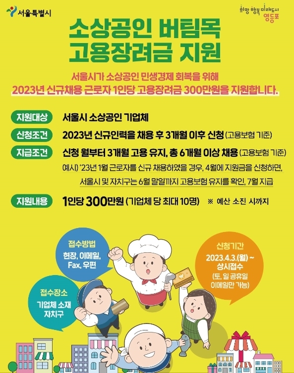 [영등포신문=이천용 기자] 영등포구가 경기 침체로 어려움을 겪는 소상공인의 신규 채용 촉진과 고용 안정을 위해 ‘소상공인 버팀목 고용장려금’을 지원한다고 밝혔다.