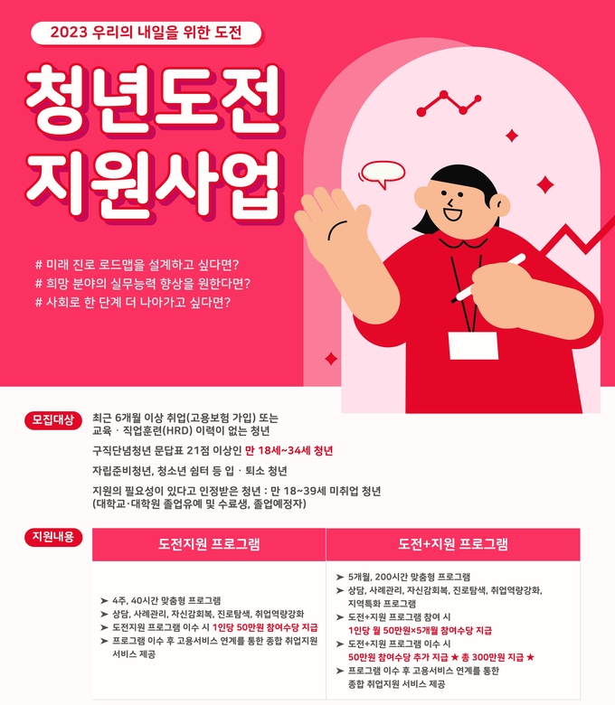 ‘청년도전 지원사업’은 구직을 포기하고 자신감을 잃은 청년들에게 맞춤형 프로그램을 제공, 청년들의 자아 탐색과 직무 역량 강화를 통해 적성에 맞는 일자리를 연계한다.