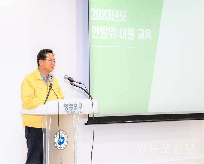 [영등포신문=이천용 기자] 최호권 구청장이 지난 12일 오후, 영등포아트홀 2층 전시실에서 개최된 ‘2023년 지역민방위 대원 집합교육’에 참석해 민방위 대원들을 격려했다.