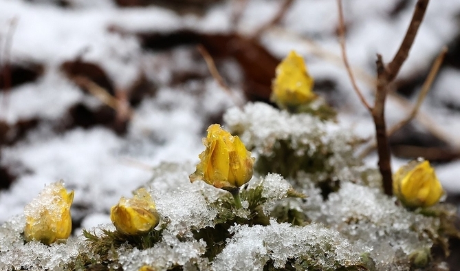 흰 눈에 덮인 봄의 전령사 복수초
