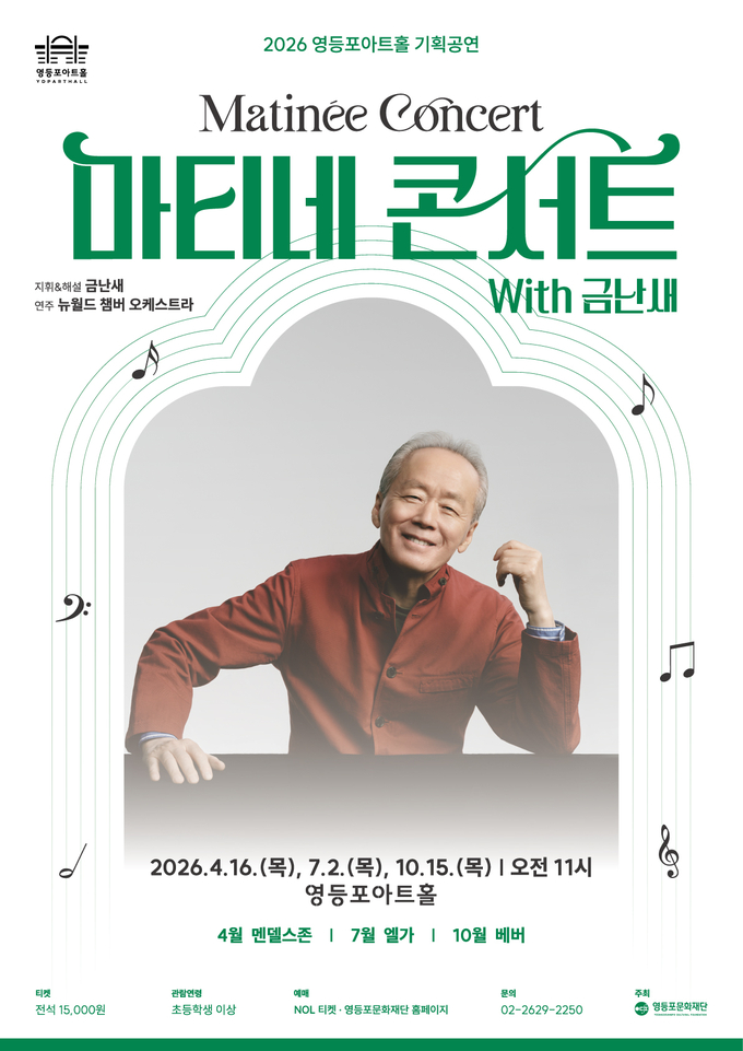 지휘자 금난새는 “이번 마티네 콘서트를 통해 영등포 구민과 시민들이 일상 속에서 클래식의 즐거움을 만끽하길 바란다”며 “고품격 공연을 통해 영등포가 서울의 새로운 클래식 음악 확산 거점으로 성장할 수 있도록 최선을 다하겠다”고 전했다.