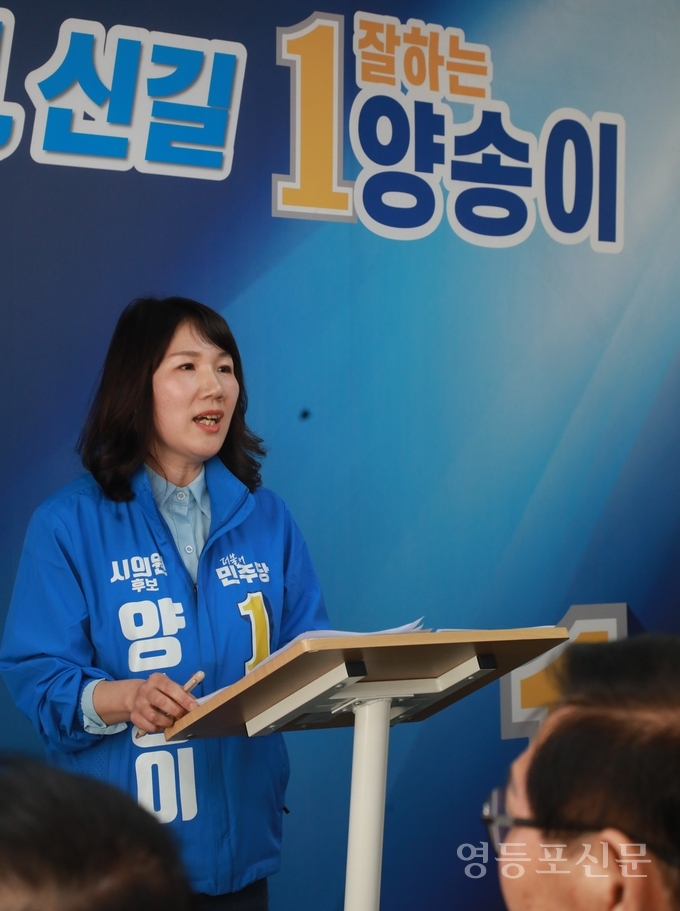 [영등포신문=이천용 기자] 6.3 지방선거에 출마한 양송이 더불어민주당 서울시의원 후보(영등포 제4선거구, 신길6동·대림1·2·3동)가 안전·교육·주거·경제·복지환경 등 5대 핵심 공약을 제시하며 본격적인 선거전에 돌입했다.