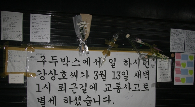 지난 3월 13일, 오토바이와 음주운전 과속차량이 충돌하는 교통사고가 발생했다. 이 사고로 인해 오토바이를 운전하던 운전자는 그 자리에서 숨을 거뒀다. 사망자는 한 쪽 팔과 다리를 자유롭게 사용하지 못 하는 지체장애 1급의 강상호씨였다. 그는 당산역 주변에서 구둣방을 운영하던 구두 수선공이었다.