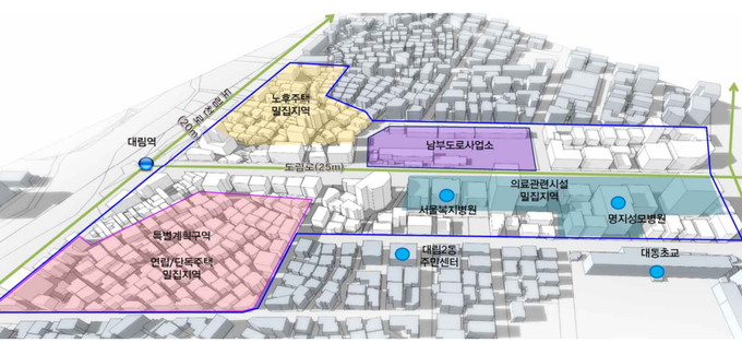 대상지는 지하철2․7호(대림역)이 교차하는 대림동 일원으로 남부도로사업소 이전 가시화 등 지역여건 변화에 따른 토지이용을 합리화 하고, 장기간 미추진 상태인 특별계획구역 해제 등의 주민의견 반영을 위해 재정비가 추진됐다.