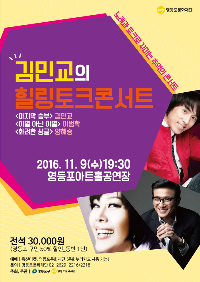11월 9일 저녁 7시 30분에 예정된 <김민교의 힐링토크콘서트>가 바로 그 공연이다. 1989년 강변가요제에서 금상을 수상하며 데뷔, 1994년이 MBC 드라마 <마지막 승부> OST <마지막 승부로> KBS <가요톱10> 5주 연속 1위, KBS 10대 가수상, MBC 7대 가수상, 골든디스크 장려상 등을 수상한 가수 김민교 뿐 아니라, 1991년 <이별 아닌 이별>로 일약 스타덤에 올라 KBS <가요톱10> 5주 연속 1위와 각종 음반 시상식에서 신인상을 수상한 가수 이범학, 미스코리아 출신 가수로 <화려한 싱글>, <결혼은 미친 짓이야> 등의 파워풀한 노래를 선사하는 가수 양혜승 이 함께 무대를 준비하고 있다.