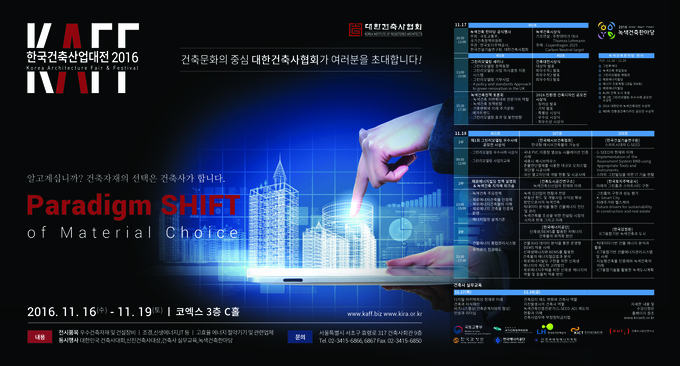 ‘더 나은 건축을 위해, Material Choice’를 주제로 개최되는 KAFF2016은 건축전문전시회, B2B 전시회, B2G 전시회 형태로 이뤄지는 국내 최고의 건축전문전시회다. 국토교통부와 국가건축정책위원회에서 주최하고 대한건축사협회가 공동주관하는 ‘2016 녹색건축한마당’과 ‘대한민국 녹색건축대전’이 동시 개최되며, 건축사 실무교육 및 각종 세미나와 신제품설명회 등이 함께 이뤄진다.