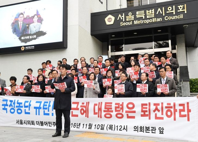 서울시의회 더불어민주당은 제271회 정례회 개회를 앞둔 10일 정오 12시에 서울시의회 의회 본관 앞에서 서울시의회 조규영 부의장을 비롯해 더불어민주당 소속 의원들이 참여한 가운데 “박근혜 대통령 퇴진촉구 기자회견”을 열고 "국정농단 규탄! 박근혜 대통령은 퇴진하라”고 촉구했다.