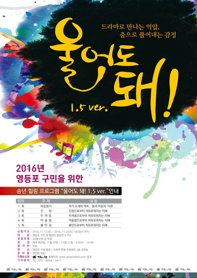 장소는 영등포 구청 별관 사회적 경제 지원센터 2층 교육실에서 실시하며 더 자세한 내용은 지혜의밭 홈페이지(www.artswisdom.com)에서 신청서를 작성 하면 된다.