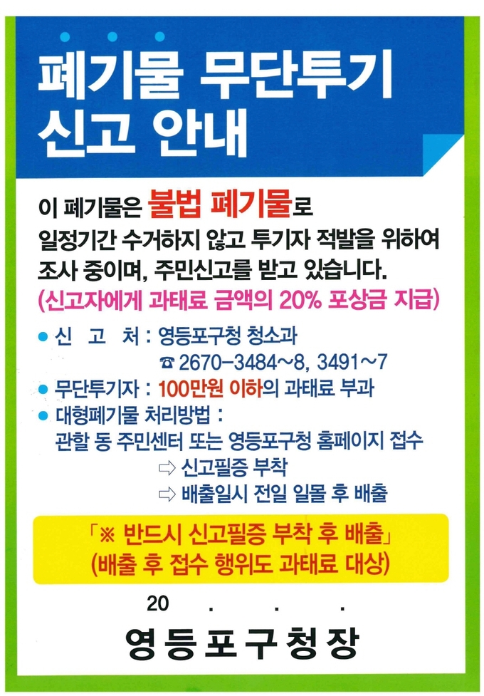 [영등포신문=이승일 기자] 영등포구가 무단투기 근절을 위해 적발된 무단투기자에게 100만원 이하의 과태료를 부과하고 신고자에게는 부과금의 20% 포상금을 지급하는 내용의 신고포상제를 운영한다고 밝혔다.