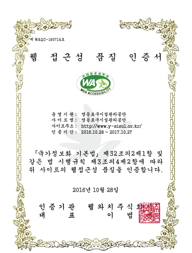 공단은 2016년 8월부터 약2개월에 걸쳐 공단이 관리하는 홈페이지를 웹접근성 관련 법률과 지침을 준수하도록 전면 신규개발 해왔으며, 그 결과 최근 공단 대표 웹사이트가 웹접근성 우수사이트 인증 및 품질인증을 취득하는 쾌거를 거둘 수 있었다.