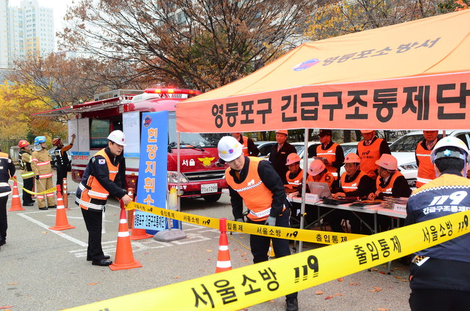 [영등포신문=육재윤 기자] 영등포소방서(서장 이귀홍)는 18일 오후 문래동에 위치한 남성아파트에서 재난발생시 신속한 상황대처능력을 높이기 위해 긴급구조통제단 불시가동훈련을 실시했다.