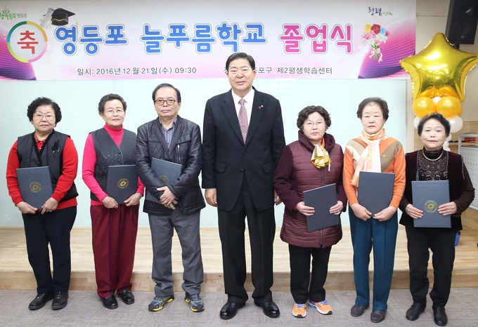 [영등포신문=김경진 기자] 조길형 구청장(오른쪽)이 21일 구청 별관 제2평생학습센터에서 열린 ‘영등포 늘푸름학교’ 첫 번째 졸업식에 참석해 졸업장을 수여하고 기념촬영을 하고 있다. 배움의 때를 놓친 성인들을 위한 ‘영등포 늘푸름학교’는 서울시 자치구 최초 초등학력 인정기관으로 올해 첫 35명의 졸업생을 배출했다.