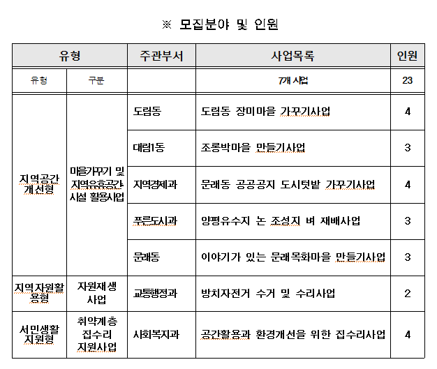 일자리는 지역 특성을 반영한 사업이 주를 이루어 마을가꾸기 및 지역유휴공간·시설활용, 자원재생, 취약계층 집수리 지원 총 3개 분야의 7개 사업에서 모집할 계획이다.