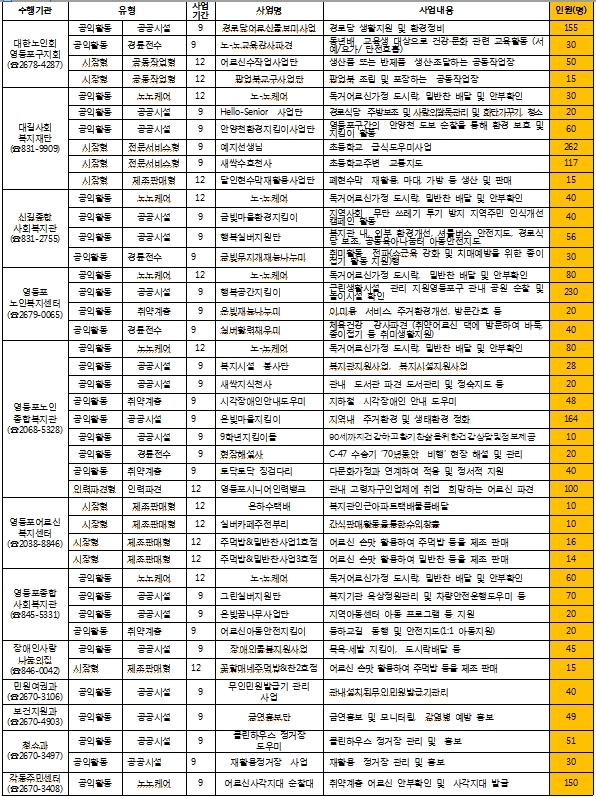 참가대상은 공익활동형의 경우 영등포구 거주 만 65세 이상 기초연금 수급자이고, 시장형은 60세 이상 어르신가운데 사업별 조건을 갖춘 자이다.