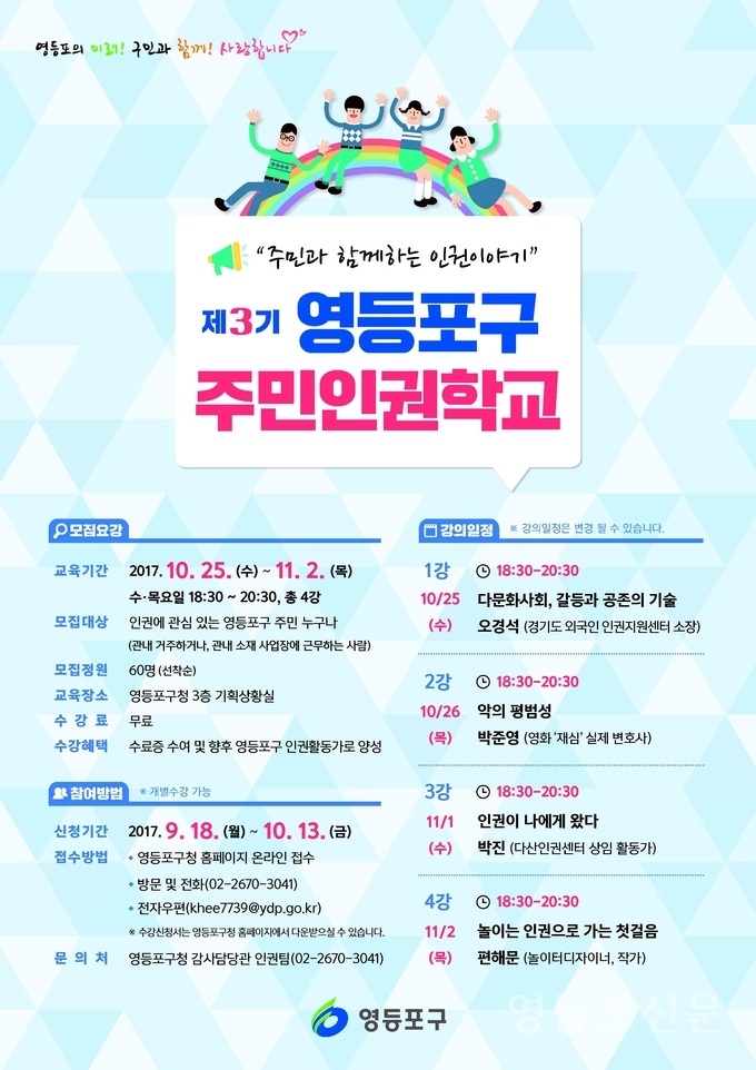 [영등포신문=양혜인 기자] 영등포구가 주민 인권보장 및 증진을 위해 ‘제3기 주민 인권학교’를 운영하고 그 수강생을 모집한다고 밝혔다.