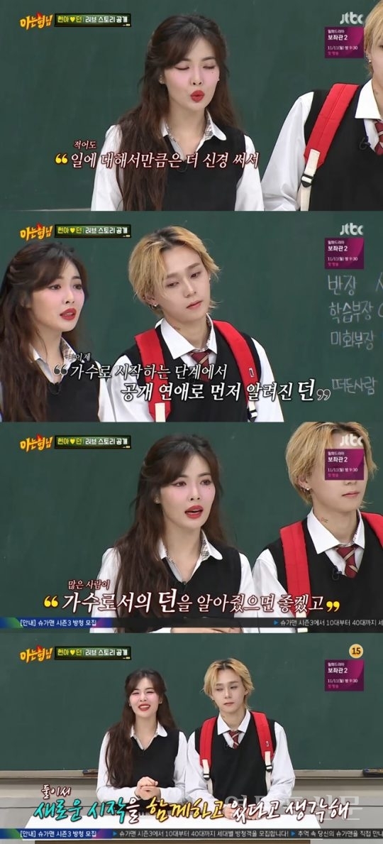 [영등포신문=변윤수 기자] 9일 방송된 JTBC ‘아는형님’에는 현아와 던이 전학생으로 등장했다. 최근 진행된 ’아는 형님’ 녹화에서 현아는 “동반 예능 출연은 아형이 최초이자 마지막일 것이다” 라고 밝혔다.