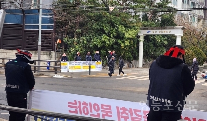 [영등포신문=이천용 기자] 영등포구 당산2동 소재 삼성래미안아파트 입주민들이 지난 2일부터 아파트 서문 입구에서 계속되고 있는 민주노총 전국건설노동조합 조합원들의 시위로 인해 많은 불편을 호소하고 있다.