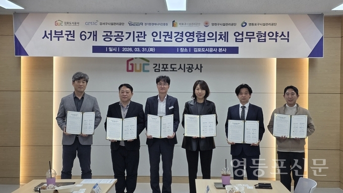 [영등포신문=나재희 기자] 영등포구시설관리공단(이사장 김형성)은 지난 3월 31일(화) 김포도시공사에서 서부권 공공기관들과 인권경영협의체를 구성하고, 기관 간 인권경영 협력 강화를 위한 업무협약을 체결했다.