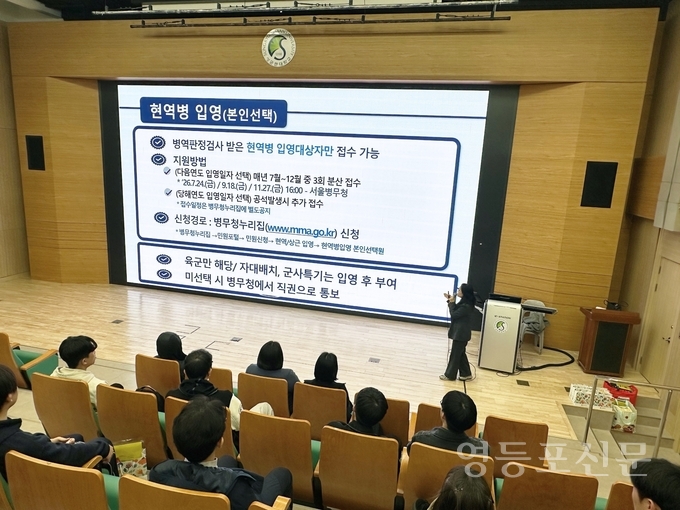 [영등포신문=나재희 기자] 서울지방병무청(청장 문경식)은 7일 성균관대학교 재학생을 대상으로 비교과 프로그램과 연계한 병역진로설계 특강 및 1대 1 병역진로 상담을 실시했다.