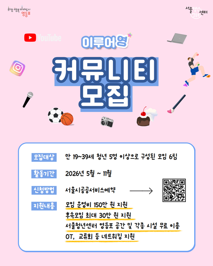 [영등포신문=변윤수 기자] 영등포구 서울청년센터가 지역 청년들의 주체적인 활동과 상호 교류를 활성화하기 위해, 청년 커뮤니티 사업인 ‘이루어영’을 운영하고, 참여팀을 모집한다고 밝혔다.