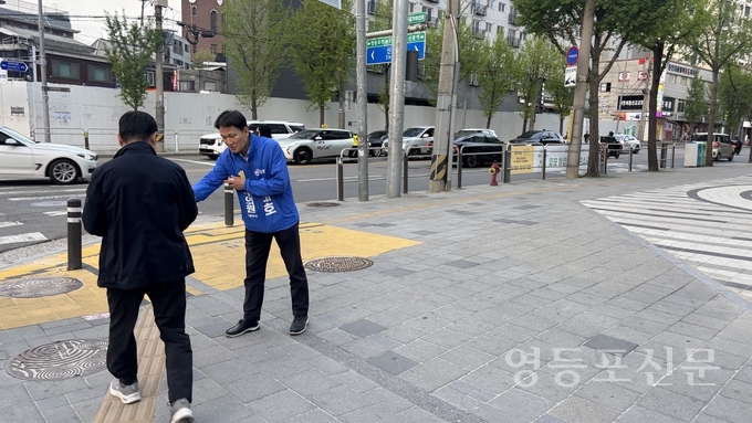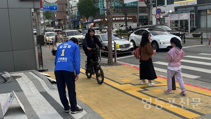 [영등포신문=이천용 기자] 김태호 더불어민주당 영등포구의원 예비후보(바선거구, 신길4·5·7동)는 16일 오후 신길가마산로 교차로에서 퇴근길 주민들에게 인사하며 지지를 호소했다.