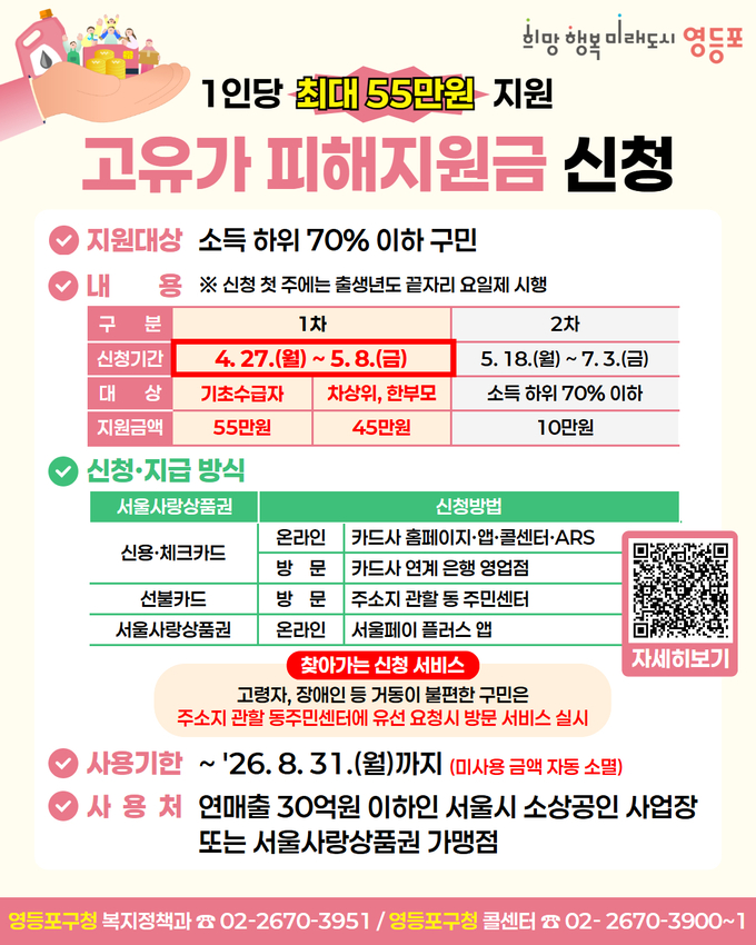 영등포구 복지정책과장은 “고유가로 어려움을 겪는 구민들의 생활 안정에 실질적인 도움이 되길 바란다”며 “신청 기간을 확인해 대상자 누락 없이 혜택을 받으시길 바란다”고 전했다.
