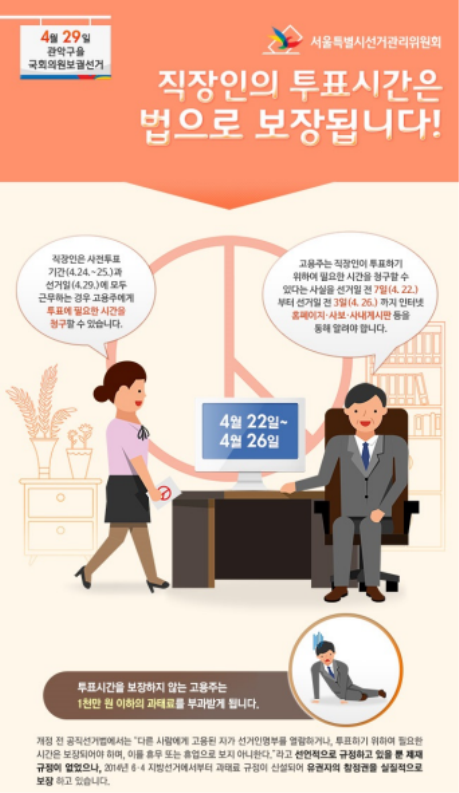 서울시선관위는 각 기관․단체․회사가 소속 임․직원들의 선거권 행사 보장에 적극 앞장서야 함을 강조하고 근로감독관 등을 통해 사업주․고용주 등에게 관련 법 규정을 숙지시켜 근로자들이 선거권 행사에 필요한 시간을 충분히 보장받을 수 있도록 해야한다고 밝히면서, 투표하는데 필요한 시간을 보장하여 주지 않는 경우 1390번으로 신고하여 줄 것을 당부하였다.