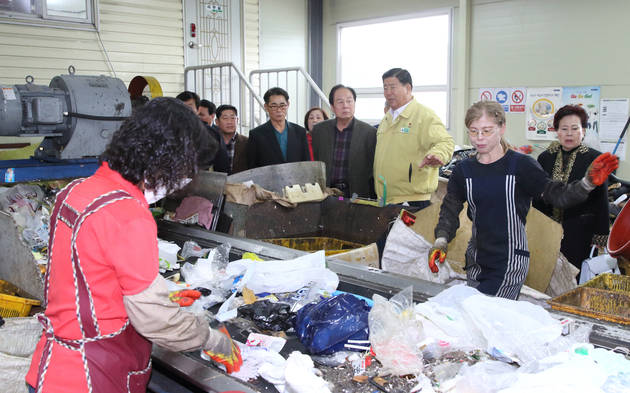 [영등포신문=이승일 기자] 조길형 구청장(가운데 노란옷)이 19일 오전 자원순환센터에서 주민자치위원장들에게 쓰레기 처리 과정을 설명하고 있다. 조 구청장은 “쓰레기 감량은 지역주민이 함께 나서야 해결할 수 있는 과제”라며 “지역주민들에게 철저한 분리수거와 쓰레기 줄이기를 적극 홍보해주시기 바란다.”고 전했다.