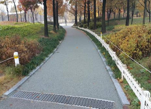주민들의 편리한 보행을 위해 산책로도 새롭게 포장했다. 원형광장 주변 산책로 1,568m 구간의 고무칩 탄성포장을 교체하고, 공원 바깥쪽 보행자도로 400m구간은 빗물이 잘 빠지는 투수블럭으로 바꾸고, 보도폭도 0.4m 더 확장해 보행 편의를 높였다.