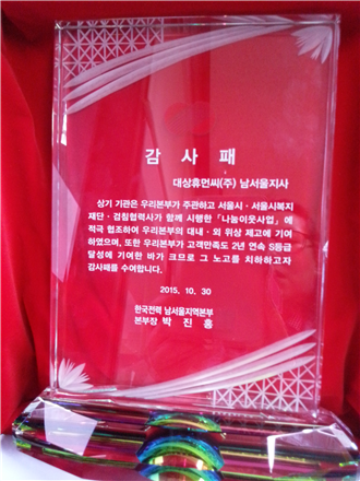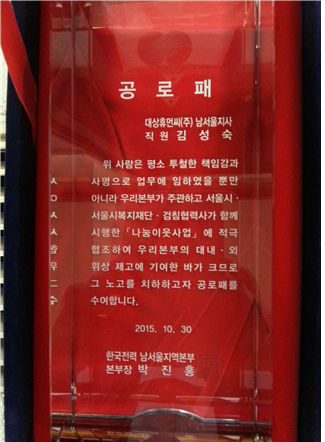 [영등포신문=김경진 기자] 한전 남서울지역본부는 서울시 복지재단과 나눔이웃사업(업무협약체결)을 실시하고, 복지사각지대에 놓인 취약계층 발굴에 적극적으로 동참해 준 공로로 지난 11월 18일 대상휴먼씨(주) 남서울지사가 한국전력 남서울지역본부 박진홍 본부장으로부터 감사패를 받았다.