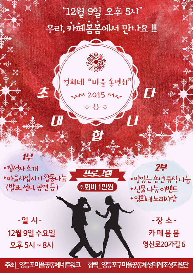 이번 행사는 2015년 한 해 동안 영등포 곳곳에서 진행된 다양한 마을살이 활동을 발표, 전시, 공연 등을 통해 공유하고, 송년음식을 함께 나누며 한 해를 마무리하는 자리로 꾸며질 예정이다.