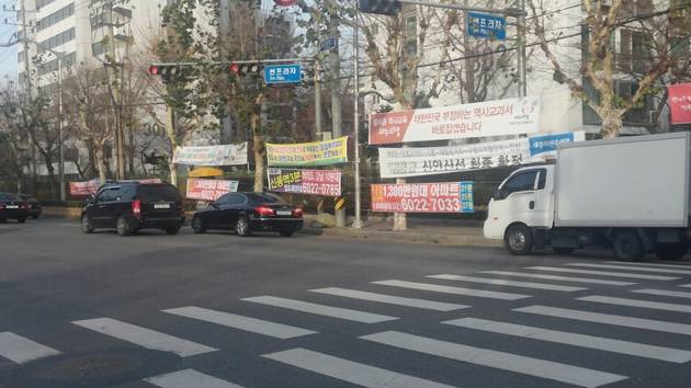 [영등포신문=김경진 기자] 12월 5일 영등포구 신길6동 우성아파트 뒷편 썬프라자 삼거리 대로변 횡단보도 주변에 10여개의 불법 현수막이 설치되어 있어 도시의 미관을 해치고, 이곳을 지나는 행인들의 눈살을 찌푸리게 하고있다.