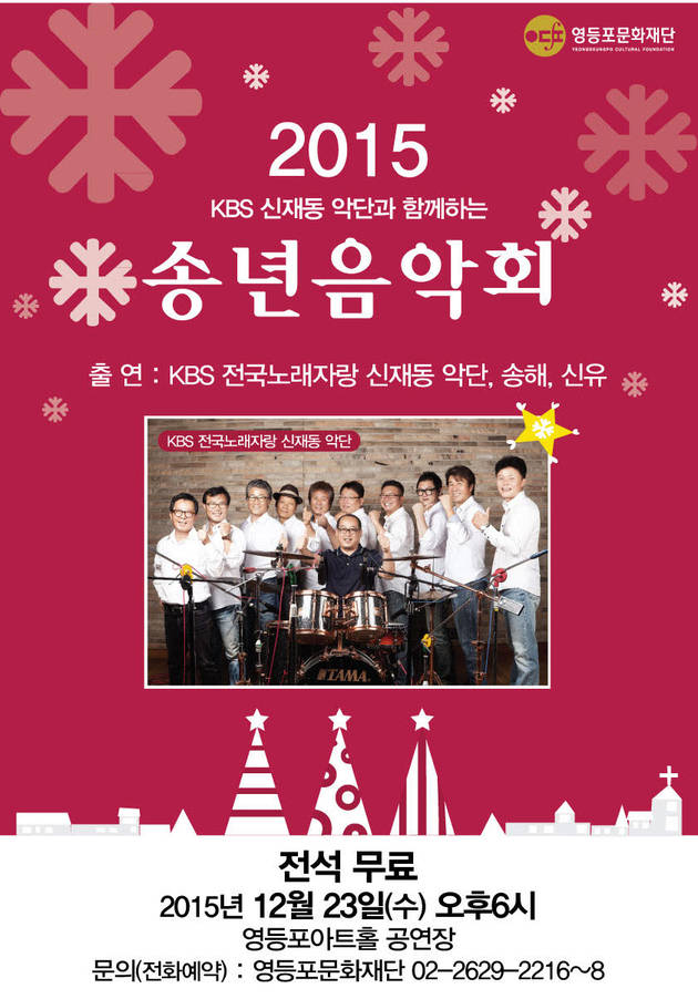 [영등포방송] 영등포문화재단은 문화적으로 소외된 취약계층의 문화향유권을 증진하고, 영등포문화재단의 브랜드 이미지 제고에 기여하고자 오는 12월 23일 오후 6시 영등포아트홀 공연장에서 ‘KBS 신재동 악단과 함께하는 송년음악회’를 개최 한다.