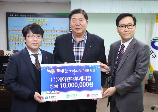 [영등포방송] 영등포구는 11일 오전 구청장실에서 에이원대부캐피탈로부터 따뜻한 겨울나기 성금 1천만원을 전달받았다. 이 성금은 지역 내 저소득층과 복지사각지대의 주민들을 위해 사용된다.