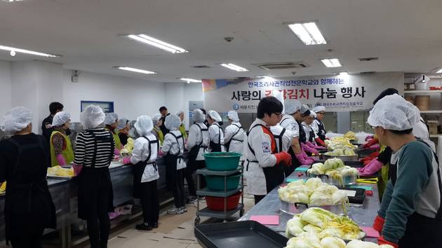 [영등포방송] 서울지방보훈청(청장 이경근)은 12월 14일 영등포구 소재 한국조리사관직업전문학교 조리실에서 호텔조리학과 교수, 학생들의 재능기부와 봉사로 홀로 생활하는 국가유공자를 위한 '사랑의 김장김치 나눔행사'를 실시했다.